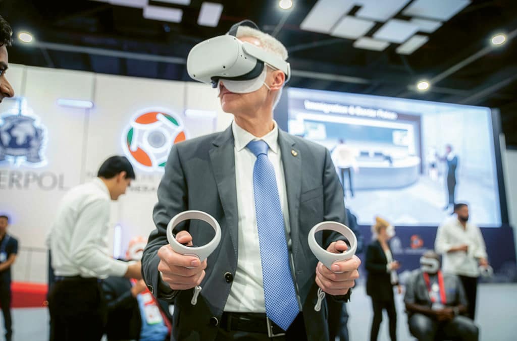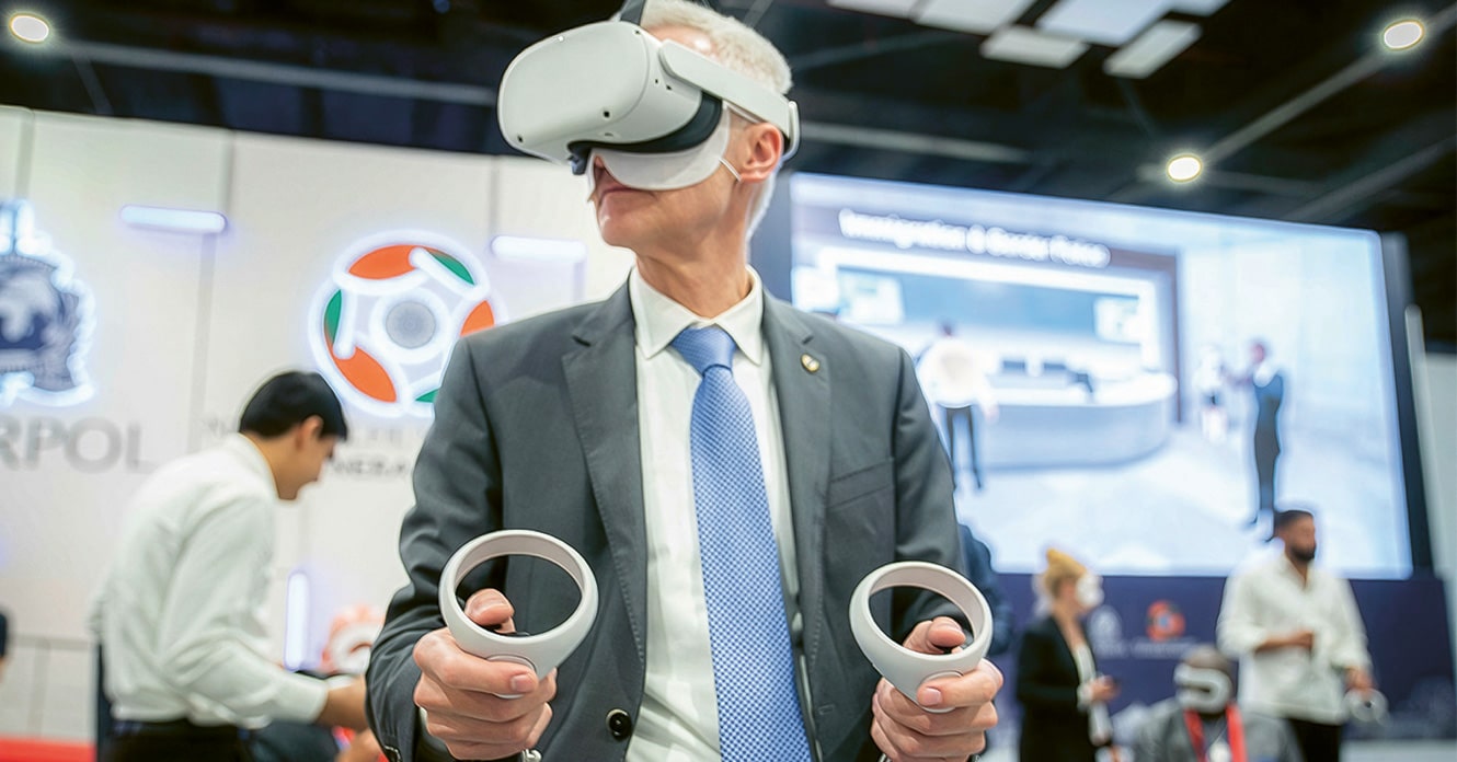 En octobre2022, Interpol a lancé son métavers, un espace dédié aux rencontres professionnelles, à la formation des forces de l’ordre et à l’anticipationdes cyber crimes émergents dans les environnements immersifs. Ci-dessus, Jürgen Stock, l’ancien secrétaire général d’Interpol, expérimente le dispositif. | © INTERPOL